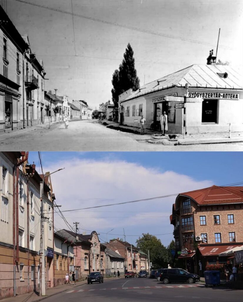 Одноповерховою була і аптека, що знаходилася поблизу реформатського костелу. Але сам будинок був доволі великим і просторим із масивними дерев’яними дверима і багатьма типовими для австро-угорської забудови невеличкими вікнами. Цю ж будівлю можна побачити й на знімках за 1936 рік із вивіскою одночасно кирилицею та латиницею (чехословацький період), і за 1939 рік, коли до Хуста увійшли угорські війська. Є вона і на листівці за 1942 рік. Тобто, пережила різну владу, різні політичні устрої, але потрапила під знесення за радянських часів. Хоча й не зразу, бо в ній колись був навіть ресторан.