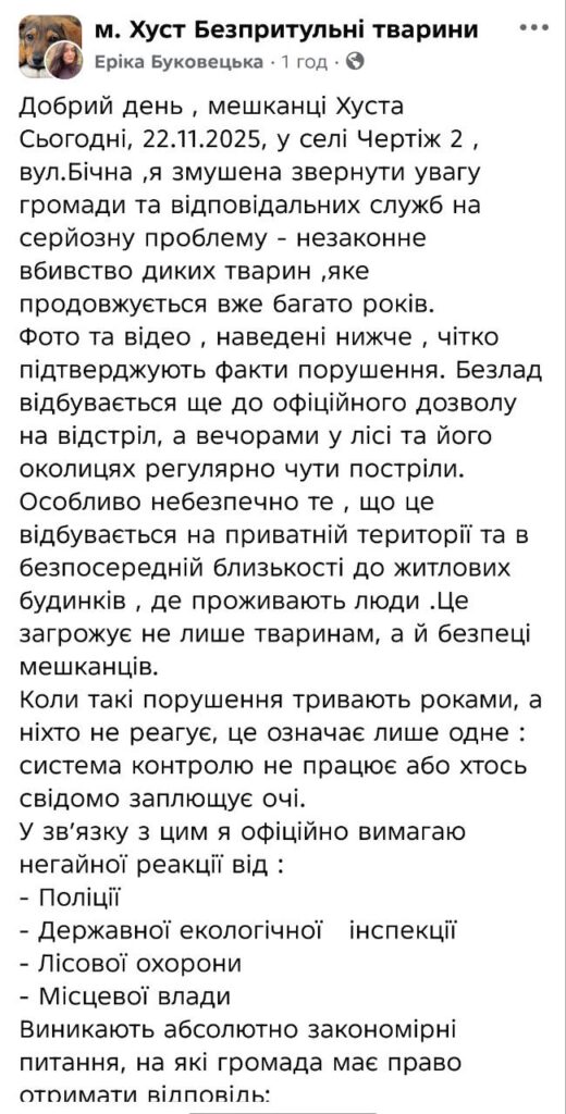 Сьогодні, 22.11.2025, у селі Чертіж 2 , вул.Бічна ,я змушена звернути увагу громади та відповідальних служб на серйозну проблему – незаконне вбивство диких тварин ,яке продовжується вже багато років.