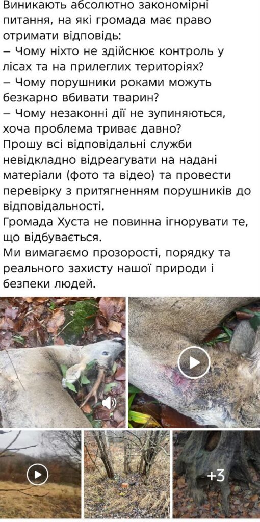 У Чертежі біля Хуста в житловому масиві відстрілюють косуль. Вбивства невинних тварин відбуваються у безпосередній близькості до житлових будинків. Такі порушення тривають роками і на них усі закривають очі!